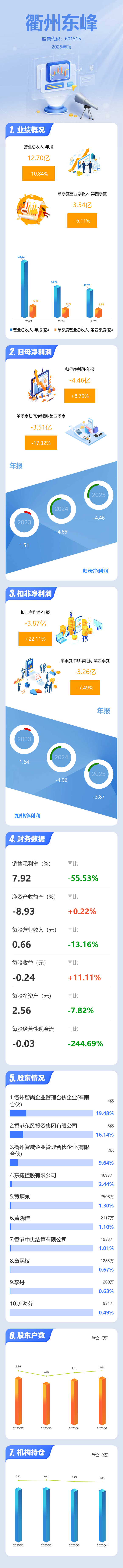 证券之星消息,衢州东峰2025年年报显示,当年度公司主营收入12.7亿元,同比下降10.84%;归母净利润-4.46亿元,同比上升8.79%;扣非净利润-3.87亿元,同比上升22.11%;其中2025年第四季度,公司单季度主营收入3.54亿元,同比下降6.12%;单季度归母净利润-3.51亿元,同比下降17.33%;单季度扣非净利润-3.26亿元,同比下降7.49%;负债率20.58%,投资收益-3217.6万元,财务费用-3017.45万元,毛利率7.92%。