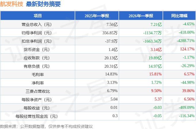 据证券之星公开数据整理,近期航发科技(600391)发布2026年一季报。截至本报告期末,公司营业总收入7.21亿元,同比下降4.65%,归母净利润-1134.77万元,同比下降418.0%。按单季度数据看,第一季度营业总收入7.21亿元,同比下降4.65%,第一季度归母净利润-1134.77万元,同比下降418.0%。本报告期航发科技公司应收账款体量较大,当期应收账款占最新年报归母净利润比达3267.57%。