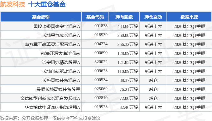持有航发科技最多的基金为国投瑞银国家安全混合A,目前规模为19.53亿元,最新净值1.3306(4月24日),较上一交易日下跌2.38%,近一年上涨35.6%。该基金现任基金经理为李轩。