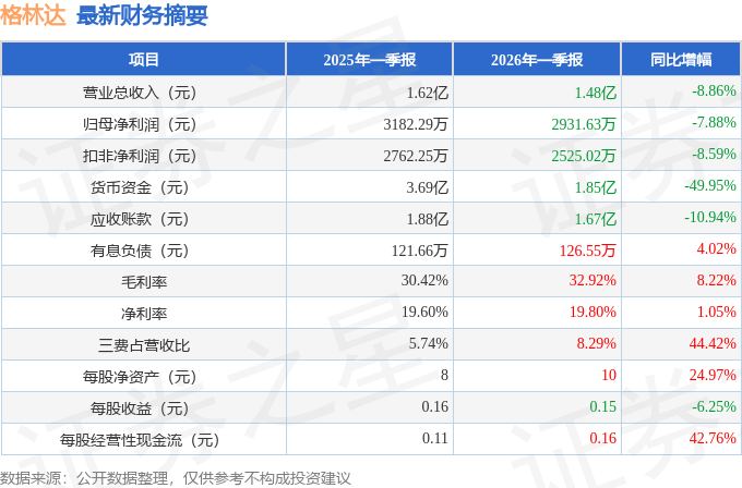 据证券之星公开数据整理,近期格林达(603931)发布2026年一季报。截至本报告期末,公司营业总收入1.48亿元,同比下降8.86%,归母净利润2931.63万元,同比下降7.88%。按单季度数据看,第一季度营业总收入1.48亿元,同比下降8.86%,第一季度归母净利润2931.63万元,同比下降7.88%。本报告期格林达盈利能力上升,毛利率同比增幅8.22%,净利率同比增幅1.05%。