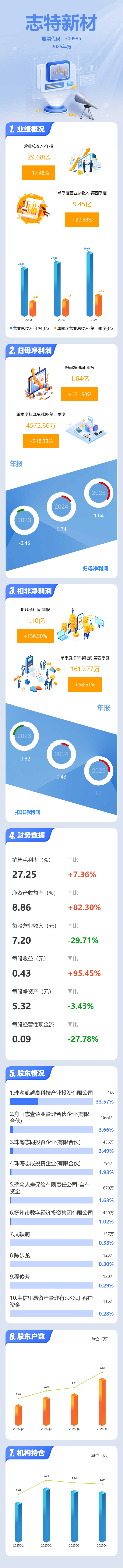 证券之星消息,志特新材2025年年报显示,当年度公司主营收入29.68亿元,同比上升17.49%;归母净利润1.64亿元,同比上升121.98%;扣非净利润1.1亿元,同比上升156.5%;其中2025年第四季度,公司单季度主营收入9.45亿元,同比上升30.99%;单季度归母净利润4572.86万元,同比上升218.34%;单季度扣非净利润1619.77万元,同比上升68.61%;负债率63.2%,投资收益-255.83万元,财务费用6399.36万元,毛利率27.25%。
