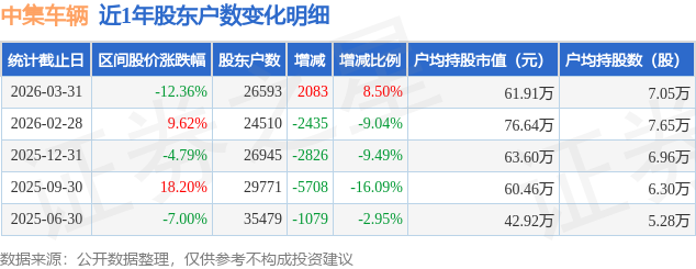 从股价来看,2026年2月28日至2026年3月31日,中集车辆区间跌幅为12.36%,在此期间股东户数增加2083.0户,增幅为8.5%。