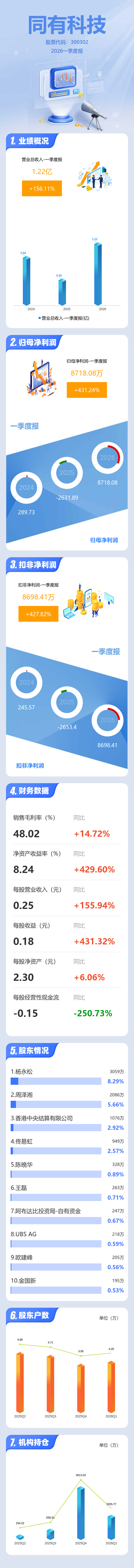 证券之星消息,同有科技2026年一季报显示,一季度公司主营收入1.22亿元,同比上升156.12%;归母净利润8718.08万元,同比上升431.25%;扣非净利润8698.41万元,同比上升427.82%;负债率40.95%,投资收益7988.21万元,财务费用474.99万元,毛利率48.02%。