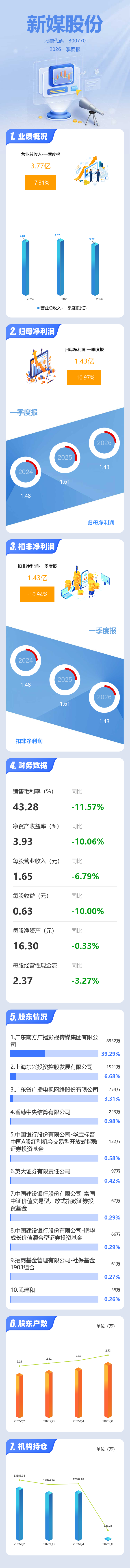 证券之星消息,新媒股份2026年一季报显示,一季度公司主营收入3.77亿元,同比下降7.32%;归母净利润1.43亿元,同比下降10.98%;扣非净利润1.43亿元,同比下降10.94%;负债率24.94%,投资收益-32.73万元,财务费用-572.39万元,毛利率43.28%。