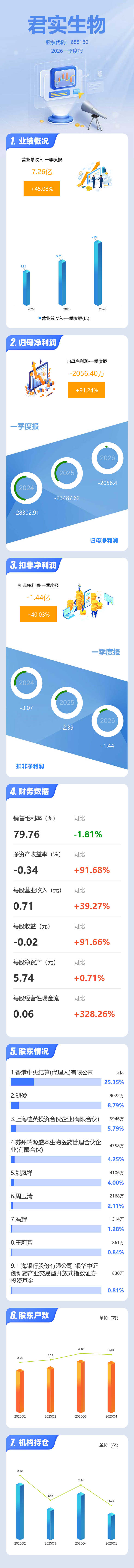 证券之星消息,君实生物2026年一季报显示,一季度公司主营收入7.26亿元,同比上升45.09%;归母净利润-2056.4万元,同比上升91.24%;扣非净利润-1.44亿元,同比上升40.03%;负债率56.97%,投资收益1.21亿元,财务费用3585.71万元,毛利率79.76%。