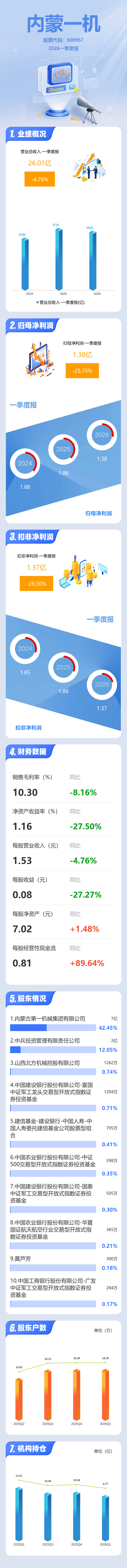 证券之星消息,内蒙一机2026年一季报显示,一季度公司主营收入26.01亿元,同比下降4.76%;归母净利润1.38亿元,同比下降25.75%;扣非净利润1.37亿元,同比下降26.31%;负债率46.79%,投资收益298.52万元,财务费用-477.09万元,毛利率10.3%。