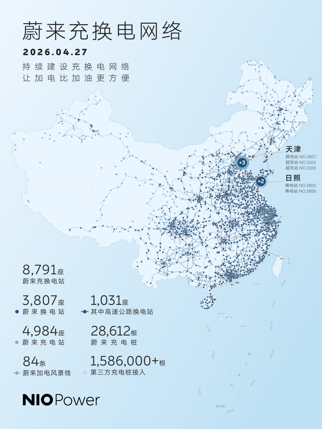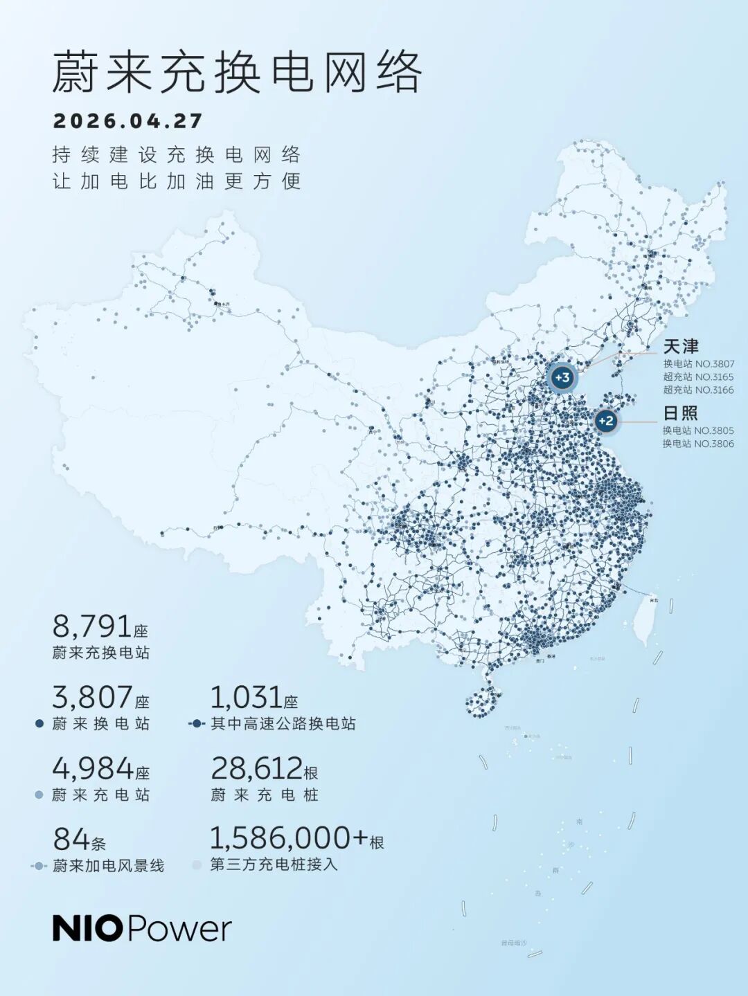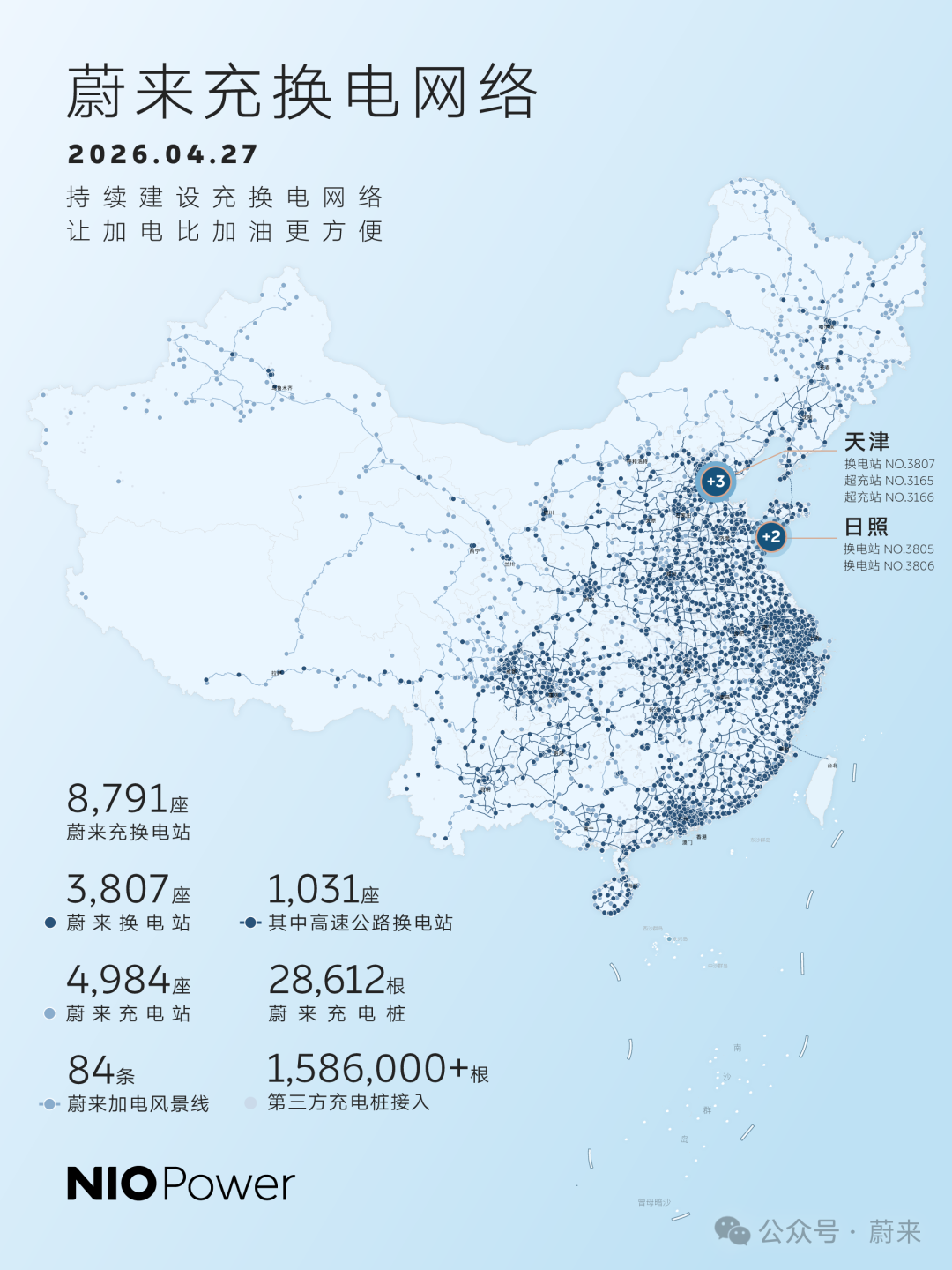 NO.3805 蔚来换电站 | G15沈海高速日照服务区海口方向NO.3806 蔚来换电站 | G15沈海高速日照服务区沈阳方向NO.3807 蔚来换电站 | 天津东丽华明博物馆NO.3165 蔚来超充站 | 天津东丽华明博物馆NO.3166 蔚来超充站 | 天津武清体育中心截至今日,蔚来全国建成8,791座充换电站,其中换电站3,807座,充电站4,984座、充电桩28,612根,累计提供超1亿次换电,持续建设,让加电比加油更方便!#蔚来 #蔚来换电去哪都方便 #蔚来ES9 #蔚来ES8 #蔚来ET5 #蔚来ET5T #蔚来ES6 #蔚来EC6 #蔚来ET9 点击即刻了解蔚来全系车型