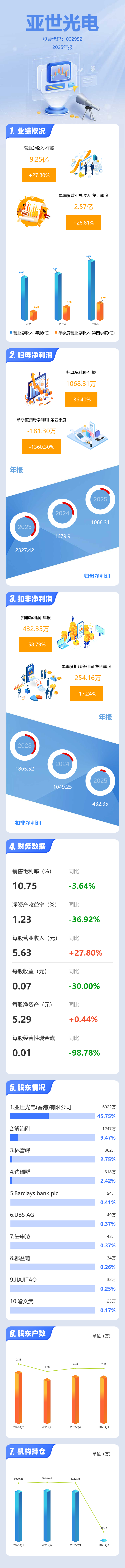 证券之星消息,亚世光电2025年年报显示,当年度公司主营收入9.25亿元,同比上升27.81%;归母净利润1068.31万元,同比下降36.41%;扣非净利润432.35万元,同比下降58.79%;其中2025年第四季度,公司单季度主营收入2.57亿元,同比上升28.82%;单季度归母净利润-181.3万元,同比下降1360.31%;单季度扣非净利润-254.16万元,同比下降17.25%;负债率21.8%,投资收益316.0万元,财务费用505.18万元,毛利率10.75%。