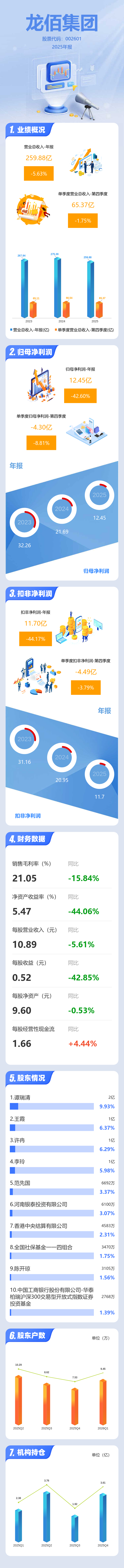 证券之星消息,龙佰集团2025年年报显示,当年度公司主营收入259.88亿元,同比下降5.63%;归母净利润12.45亿元,同比下降42.61%;扣非净利润11.7亿元,同比下降44.18%;其中2025年第四季度,公司单季度主营收入65.37亿元,同比下降1.76%;单季度归母净利润-4.3亿元,同比下降8.81%;单季度扣非净利润-4.49亿元,同比下降3.8%;负债率57.54%,投资收益-9913.38万元,财务费用4.02亿元,毛利率21.05%。