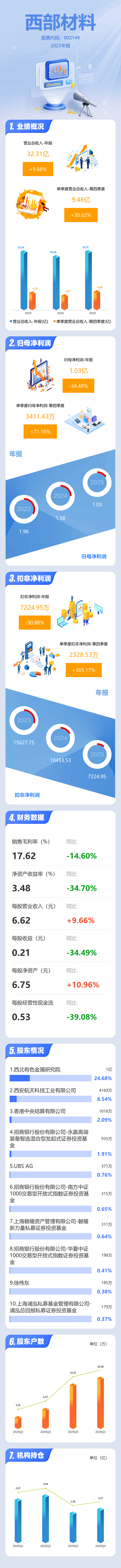 证券之星消息,西部材料2025年年报显示,当年度公司主营收入32.31亿元,同比上升9.67%;归母净利润1.03亿元,同比下降34.48%;扣非净利润7224.95万元,同比下降30.89%;其中2025年第四季度,公司单季度主营收入9.48亿元,同比上升30.62%;单季度归母净利润3411.43万元,同比上升71.16%;单季度扣非净利润2328.53万元,同比上升365.17%;负债率49.15%,投资收益2872.78万元,财务费用3367.79万元,毛利率17.62%。