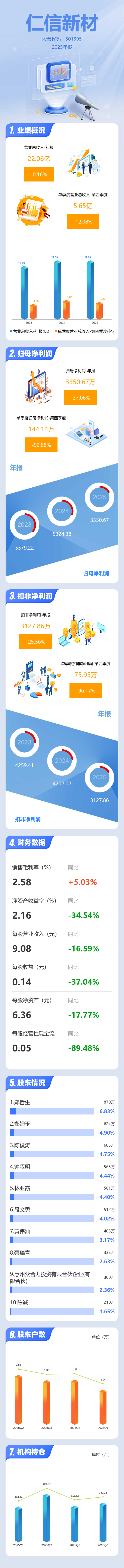 证券之星消息,仁信新材2025年年报显示,当年度公司主营收入22.06亿元,同比下降0.17%;归母净利润3350.67万元,同比下降37.07%;扣非净利润3127.86万元,同比下降25.56%;其中2025年第四季度,公司单季度主营收入5.65亿元,同比下降12.09%;单季度归母净利润144.14万元,同比下降92.88%;单季度扣非净利润75.95万元,同比下降96.17%;负债率23.28%,投资收益909.96万元,财务费用270.86万元,毛利率2.58%。