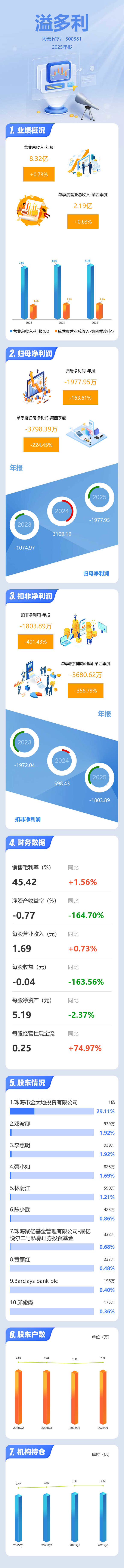 证券之星消息,溢多利2025年年报显示,当年度公司主营收入8.32亿元,同比上升0.73%;归母净利润-1977.95万元,同比下降163.62%;扣非净利润-1803.89万元,同比下降401.44%;其中2025年第四季度,公司单季度主营收入2.19亿元,同比上升0.64%;单季度归母净利润-3798.39万元,同比下降224.46%;单季度扣非净利润-3680.62万元,同比下降356.79%;负债率11.34%,投资收益176.02万元,财务费用-540.51万元,毛利率45.42%。