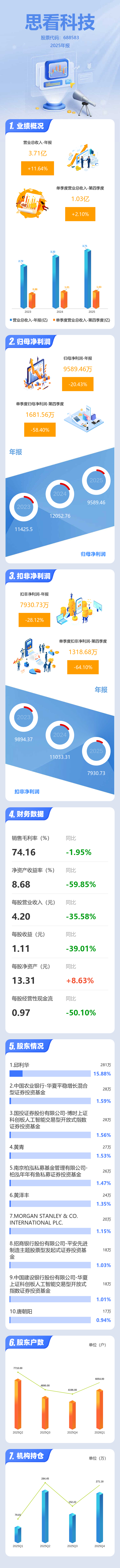 证券之星消息,思看科技2025年年报显示,当年度公司主营收入3.71亿元,同比上升11.65%;归母净利润9589.46万元,同比下降20.44%;扣非净利润7930.73万元,同比下降28.12%;其中2025年第四季度,公司单季度主营收入1.03亿元,同比上升2.1%;单季度归母净利润1681.56万元,同比下降58.4%;单季度扣非净利润1318.68万元,同比下降64.1%;负债率11.24%,投资收益1657.31万元,财务费用-337.77万元,毛利率74.16%。