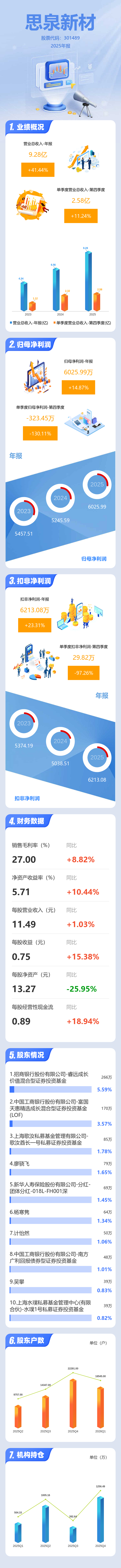 证券之星消息,思泉新材2025年年报显示,当年度公司主营收入9.28亿元,同比上升41.45%;归母净利润6025.99万元,同比上升14.88%;扣非净利润6213.08万元,同比上升23.31%;其中2025年第四季度,公司单季度主营收入2.58亿元,同比上升11.24%;单季度归母净利润-323.45万元,同比下降130.11%;单季度扣非净利润29.82万元,同比下降97.26%;负债率36.37%,投资收益103.52万元,财务费用317.17万元,毛利率27.0%。