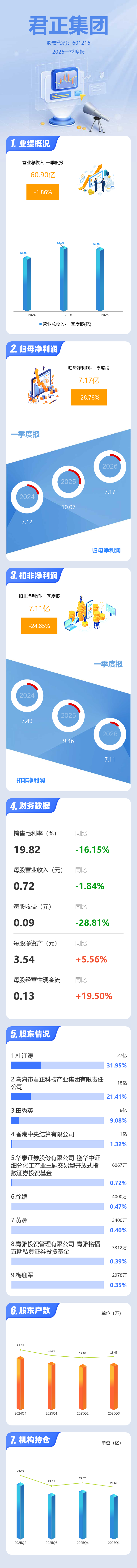 证券之星消息,君正集团2026年一季报显示,一季度公司主营收入60.9亿元,同比下降1.86%;归母净利润7.17亿元,同比下降28.78%;扣非净利润7.11亿元,同比下降24.86%;负债率28.45%,投资收益5961.14万元,财务费用5279.17万元,毛利率19.82%。