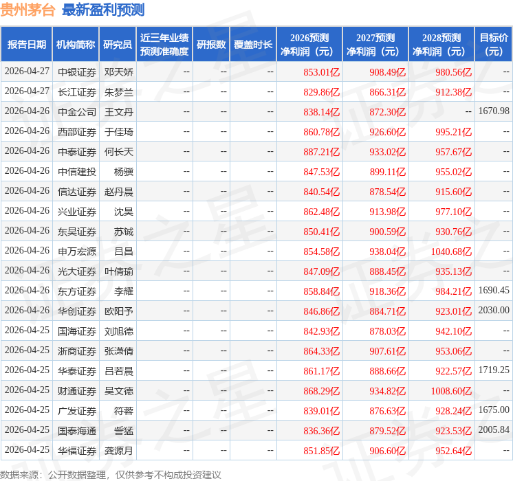 最新盈利预测明细如下: