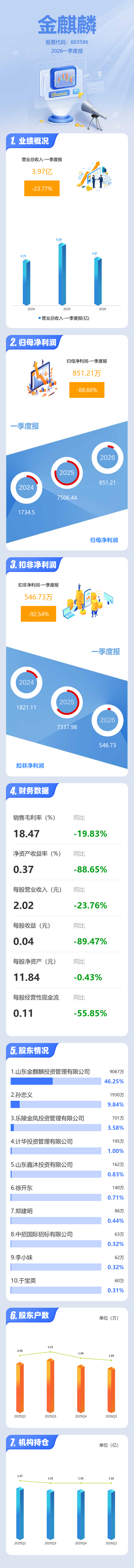 证券之星消息,金麒麟2026年一季报显示,一季度公司主营收入3.97亿元,同比下降23.77%;归母净利润851.21万元,同比下降88.66%;扣非净利润546.73万元,同比下降92.55%;负债率13.49%,投资收益361.78万元,财务费用1661.06万元,毛利率18.47%。
