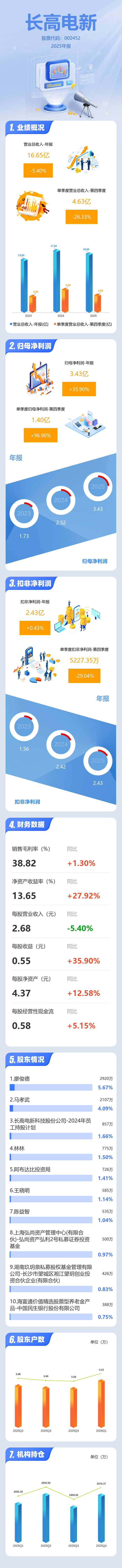 证券之星消息,长高电新2025年年报显示,当年度公司主营收入16.65亿元,同比下降5.41%;归母净利润3.43亿元,同比上升35.91%;扣非净利润2.43亿元,同比上升0.44%;其中2025年第四季度,公司单季度主营收入4.63亿元,同比下降26.33%;单季度归母净利润1.4亿元,同比上升96.91%;单季度扣非净利润5227.35万元,同比下降29.05%;负债率27.47%,投资收益1.28亿元,财务费用-506.95万元,毛利率38.82%。