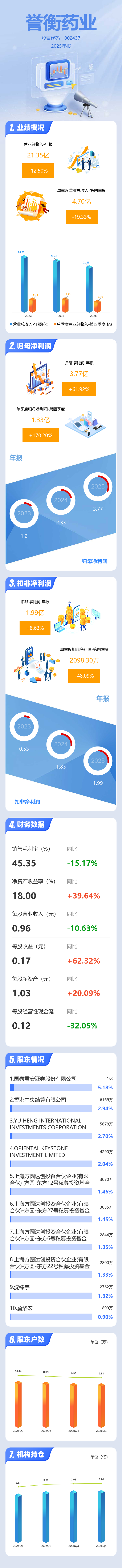 证券之星消息,誉衡药业2025年年报显示,当年度公司主营收入21.35亿元,同比下降12.51%;归母净利润3.77亿元,同比上升61.93%;扣非净利润1.99亿元,同比上升8.64%;其中2025年第四季度,公司单季度主营收入4.7亿元,同比下降19.34%;单季度归母净利润1.33亿元,同比上升170.21%;单季度扣非净利润2098.3万元,同比下降48.09%;负债率26.32%,投资收益1.37亿元,财务费用-34.05万元,毛利率45.35%。
