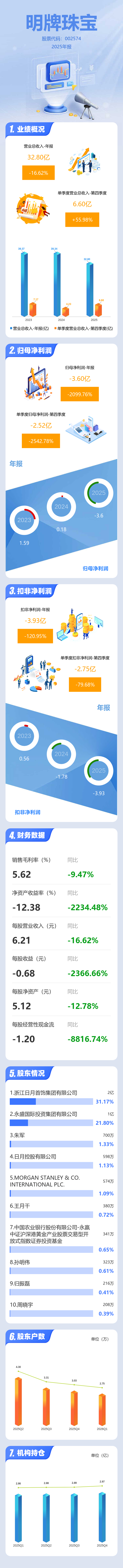 证券之星消息,明牌珠宝2025年年报显示,当年度公司主营收入32.8亿元,同比下降16.62%;归母净利润-3.6亿元,同比下降2099.76%;扣非净利润-3.93亿元,同比下降120.95%;其中2025年第四季度,公司单季度主营收入6.6亿元,同比上升55.99%;单季度归母净利润-2.52亿元,同比下降2542.79%;单季度扣非净利润-2.75亿元,同比下降79.68%;负债率58.15%,投资收益9187.81万元,财务费用7705.77万元,毛利率5.62%。