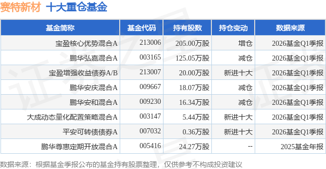 根据2026基金Q1季报公募基金重仓股数据,重仓该股的公募基金共7家,其中持有数量最多的公募基金为宝盈基金的宝盈核心优势混合A。宝盈核心优势混合A目前规模为4.97亿元,最新净值0.8315(4月24日),较上一交易日下跌0.34%,近一年上涨13.31%。该公募基金现任基金经理为吕功绩。吕功绩在任的基金产品包括:宝盈龙头优选股票A,管理时间为2025年1月25日至今,期间收益率为7.9%;宝盈品质甄选混合A,管理时间为2025年8月2日至今,期间收益率为-5.71%;宝盈增强收益债券A/B,管理时间为2025年8月2日至今,期间收益率为5.4%。