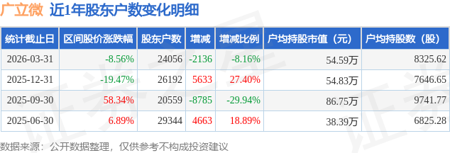 从股价来看,2025年12月31日至2026年3月31日,广立微区间跌幅为8.56%,在此期间股东户数减少2136.0户,减幅为8.16%。