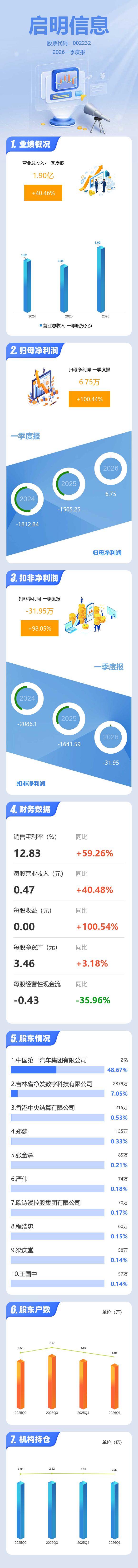 证券之星消息,启明信息2026年一季报显示,一季度公司主营收入1.9亿元,同比上升40.46%;归母净利润6.75万元,同比上升100.45%;扣非净利润-31.95万元,同比上升98.05%;负债率25.48%,财务费用-180.26万元,毛利率12.83%。