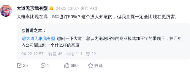 @大道无形我有型 想问一下大道,您认为泡泡玛特的商业模式加王宁的带领下,在五年内公司能走到一个什么样的高度