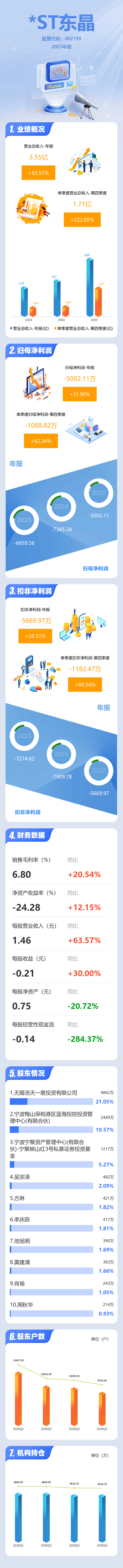 证券之星消息,*ST东晶2025年年报显示,当年度公司主营收入3.55亿元,同比上升63.57%;归母净利润-5002.11万元,同比上升31.9%;扣非净利润-5669.97万元,同比上升28.32%;其中2025年第四季度,公司单季度主营收入1.71亿元,同比上升222.05%;单季度归母净利润-1088.82万元,同比上升62.34%;单季度扣非净利润-1182.47万元,同比上升60.55%;负债率68.45%,投资收益2.11万元,财务费用466.45万元,毛利率6.8%。