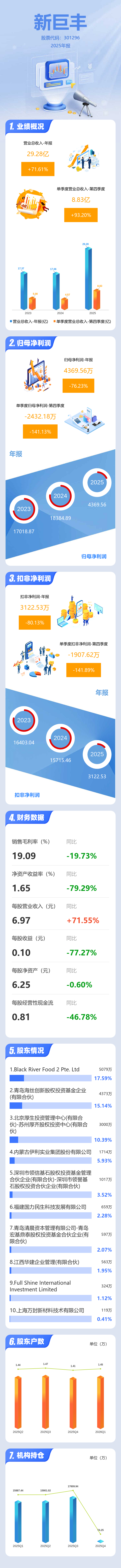 证券之星消息,新巨丰2025年年报显示,当年度公司主营收入29.28亿元,同比上升71.61%;归母净利润4369.56万元,同比下降76.23%;扣非净利润3122.53万元,同比下降80.13%;其中2025年第四季度,公司单季度主营收入8.83亿元,同比上升93.21%;单季度归母净利润-2432.18万元,同比下降141.14%;单季度扣非净利润-1907.62万元,同比下降141.9%;负债率54.58%,投资收益468.22万元,财务费用6762.14万元,毛利率19.09%。