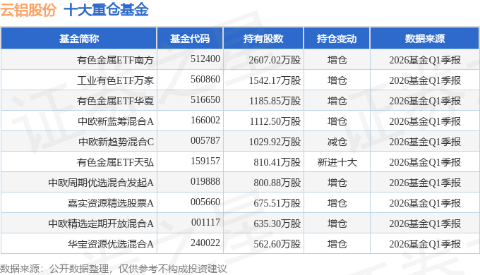 持有云铝股份最多的基金为有色金属ETF南方,目前规模为275.67亿元,最新净值2.0966(4月23日),较上一交易日下跌3.86%,近一年上涨102.61%。该基金现任基金经理为崔蕾。