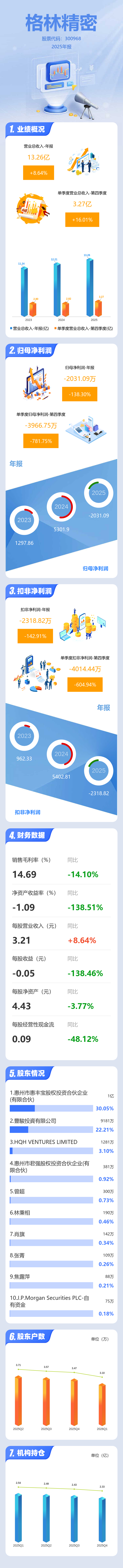 证券之星消息,格林精密2025年年报显示,当年度公司主营收入13.26亿元,同比上升8.64%;归母净利润-2031.09万元,同比下降138.31%;扣非净利润-2318.82万元,同比下降142.92%;其中2025年第四季度,公司单季度主营收入3.27亿元,同比上升16.01%;单季度归母净利润-3966.75万元,同比下降781.75%;单季度扣非净利润-4014.44万元,同比下降604.95%;负债率17.43%,投资收益364.37万元,财务费用-1150.16万元,毛利率14.69%。