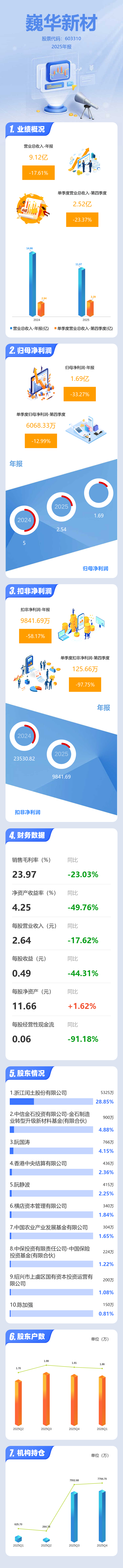 证券之星消息,巍华新材2025年年报显示,当年度公司主营收入9.12亿元,同比下降17.62%;归母净利润1.69亿元,同比下降33.27%;扣非净利润9841.69万元,同比下降58.18%;其中2025年第四季度,公司单季度主营收入2.52亿元,同比下降23.37%;单季度归母净利润6068.33万元,同比下降13.0%;单季度扣非净利润125.66万元,同比下降97.76%;负债率14.68%,投资收益-1047.66万元,财务费用-2673.84万元,毛利率23.97%。