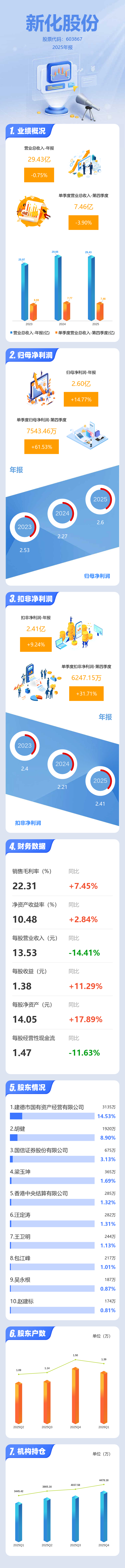 证券之星消息,新化股份2025年年报显示,当年度公司主营收入29.43亿元,同比下降0.76%;归母净利润2.6亿元,同比上升14.78%;扣非净利润2.41亿元,同比上升9.25%;其中2025年第四季度,公司单季度主营收入7.46亿元,同比下降3.91%;单季度归母净利润7543.46万元,同比上升61.54%;单季度扣非净利润6247.15万元,同比上升31.71%;负债率27.77%,投资收益-75.31万元,财务费用1867.34万元,毛利率22.31%。