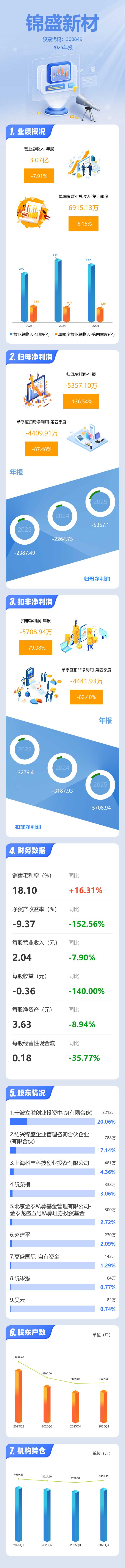 证券之星消息,锦盛新材2025年年报显示,当年度公司主营收入3.07亿元,同比下降7.91%;归母净利润-5357.1万元,同比下降136.54%;扣非净利润-5708.94万元,同比下降79.08%;其中2025年第四季度,公司单季度主营收入6915.13万元,同比下降6.15%;单季度归母净利润-4409.91万元,同比下降87.48%;单季度扣非净利润-4441.93万元,同比下降82.41%;负债率21.03%,财务费用136.88万元,毛利率18.1%。