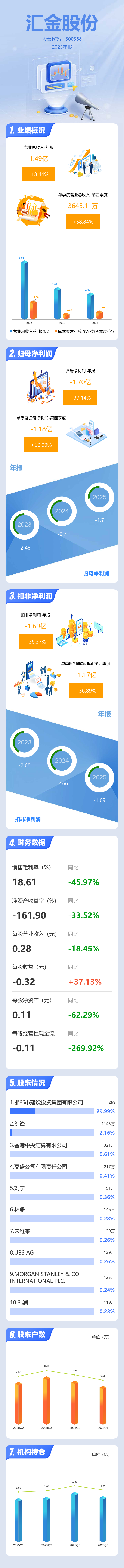 证券之星消息,汇金股份2025年年报显示,当年度公司主营收入1.49亿元,同比下降18.45%;归母净利润-1.7亿元,同比上升37.15%;扣非净利润-1.69亿元,同比上升36.37%;其中2025年第四季度,公司单季度主营收入3645.11万元,同比上升58.84%;单季度归母净利润-1.18亿元,同比上升51.0%;单季度扣非净利润-1.17亿元,同比上升36.9%;负债率64.38%,投资收益-905.3万元,财务费用1085.35万元,毛利率18.61%。