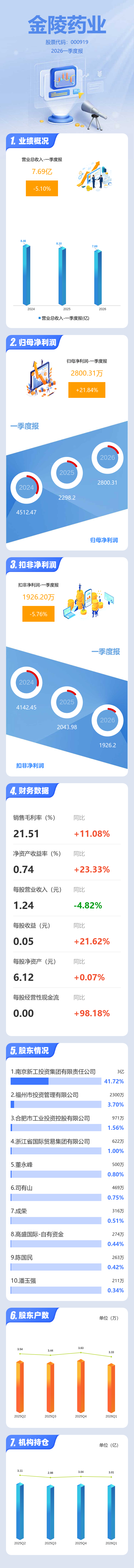 证券之星消息,金陵药业2026年一季报显示,一季度公司主营收入7.69亿元,同比下降5.1%;归母净利润2800.31万元,同比上升21.85%;扣非净利润1926.2万元,同比下降5.76%;负债率19.36%,投资收益382.04万元,财务费用-99.56万元,毛利率21.51%。