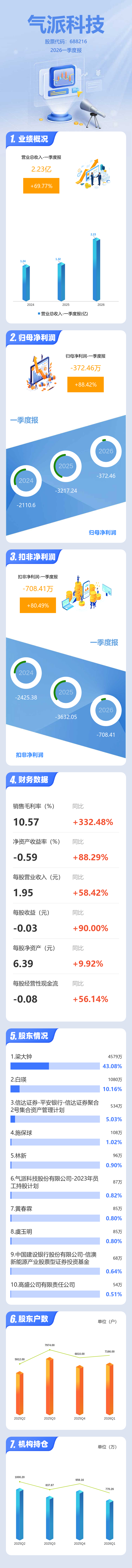 证券之星消息,气派科技2026年一季报显示,一季度公司主营收入2.23亿元,同比上升69.77%;归母净利润-372.46万元,同比上升88.42%;扣非净利润-708.41万元,同比上升80.5%;负债率62.13%,投资收益6.61万元,财务费用555.2万元,毛利率10.57%。
