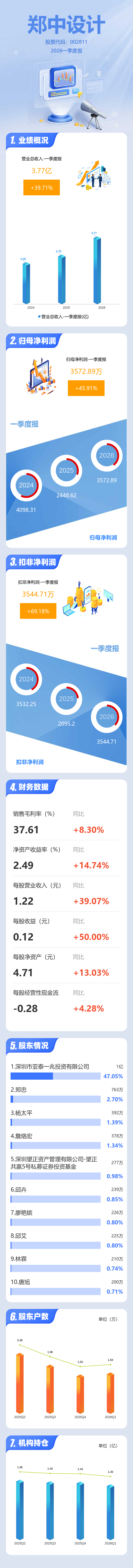 证券之星消息,郑中设计2026年一季报显示,一季度公司主营收入3.77亿元,同比上升39.72%;归母净利润3572.89万元,同比上升45.91%;扣非净利润3544.71万元,同比上升69.18%;负债率44.94%,投资收益76.58万元,财务费用0.99万元,毛利率37.61%。