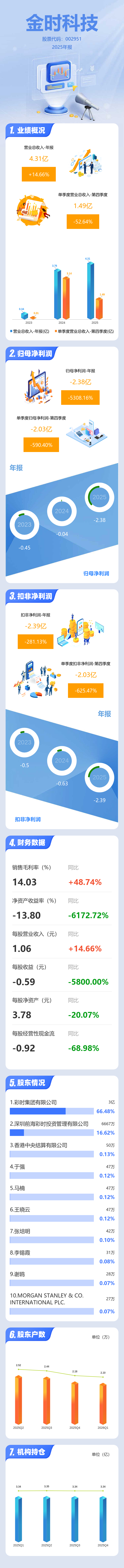 证券之星消息,金时科技2025年年报显示,当年度公司主营收入4.31亿元,同比上升14.67%;归母净利润-2.38亿元,同比下降5308.16%;扣非净利润-2.39亿元,同比下降281.13%;其中2025年第四季度,公司单季度主营收入1.49亿元,同比下降52.64%;单季度归母净利润-2.03亿元,同比下降590.41%;单季度扣非净利润-2.03亿元,同比下降625.48%;负债率21.63%,投资收益2576.28万元,财务费用-761.38万元,毛利率14.03%。
