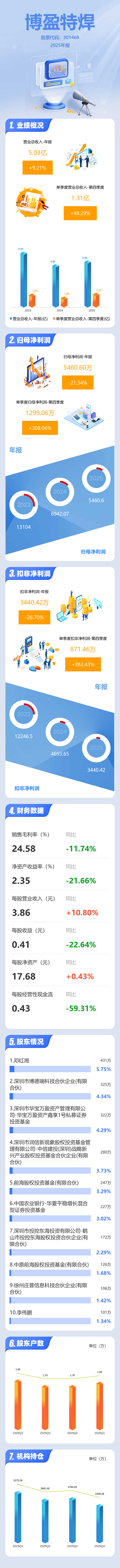 证券之星消息,博盈特焊2025年年报显示,当年度公司主营收入5.03亿元,同比上升9.22%;归母净利润5460.6万元,同比下降21.34%;扣非净利润3440.42万元,同比下降26.7%;其中2025年第四季度,公司单季度主营收入1.31亿元,同比上升48.3%;单季度归母净利润1299.06万元,同比上升308.07%;单季度扣非净利润871.46万元,同比上升382.44%;负债率9.12%,投资收益1786.39万元,财务费用-752.71万元,毛利率24.58%。