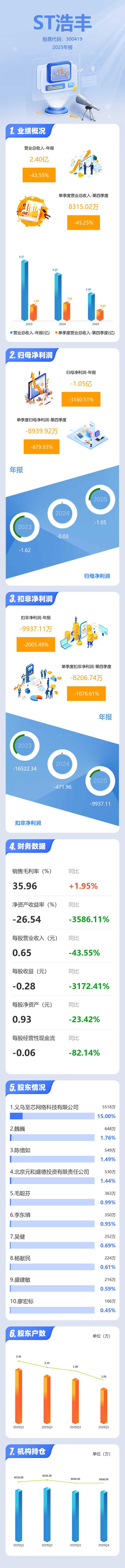 证券之星消息,ST浩丰2025年年报显示,当年度公司主营收入2.4亿元,同比下降43.56%;归母净利润-1.05亿元,同比下降3160.51%;扣非净利润-9937.11万元,同比下降2005.49%;其中2025年第四季度,公司单季度主营收入8315.02万元,同比下降45.26%;单季度归母净利润-8939.92万元,同比下降879.94%;单季度扣非净利润-8206.74万元,同比下降1076.62%;负债率36.94%,投资收益-1724.67万元,财务费用379.2万元,毛利率35.96%。