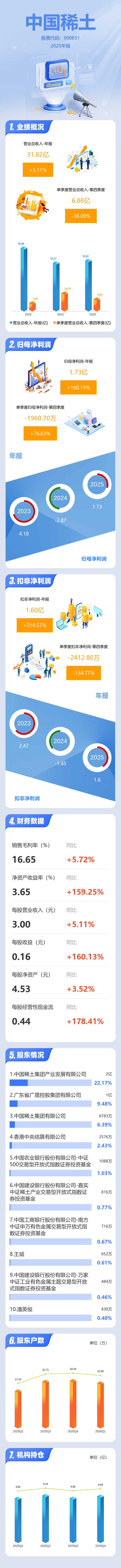 证券之星消息,中国稀土2025年年报显示,当年度公司主营收入31.82亿元,同比上升5.11%;归母净利润1.73亿元,同比上升160.15%;扣非净利润1.6亿元,同比上升210.57%;其中2025年第四季度,公司单季度主营收入6.88亿元,同比下降36.0%;单季度归母净利润-1960.7万元,同比上升76.63%;单季度扣非净利润-2412.8万元,同比下降134.78%;负债率13.1%,投资收益1597.0万元,财务费用394.95万元,毛利率16.65%。