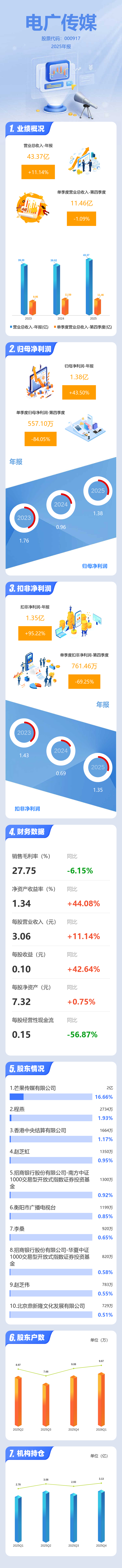 证券之星消息,电广传媒2025年年报显示,当年度公司主营收入43.37亿元,同比上升11.15%;归母净利润1.38亿元,同比上升43.51%;扣非净利润1.35亿元,同比上升95.22%;其中2025年第四季度,公司单季度主营收入11.46亿元,同比下降1.09%;单季度归母净利润557.1万元,同比下降84.06%;单季度扣非净利润761.46万元,同比下降69.26%;负债率32.75%,投资收益1.18亿元,财务费用8672.31万元,毛利率27.75%。