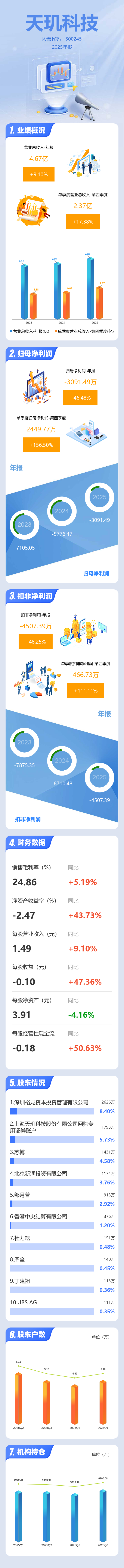 证券之星消息,天玑科技2025年年报显示,当年度公司主营收入4.67亿元,同比上升9.11%;归母净利润-3091.49万元,同比上升46.48%;扣非净利润-4507.39万元,同比上升48.25%;其中2025年第四季度,公司单季度主营收入2.37亿元,同比上升17.39%;单季度归母净利润2449.77万元,同比上升156.5%;单季度扣非净利润466.73万元,同比上升111.11%;负债率21.0%,投资收益897.46万元,财务费用-127.95万元,毛利率24.86%。