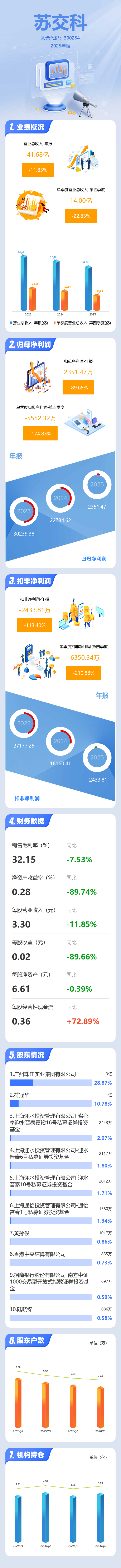 证券之星消息,苏交科2025年年报显示,当年度公司主营收入41.68亿元,同比下降11.85%;归母净利润2351.47万元,同比下降89.66%;扣非净利润-2433.81万元,同比下降113.4%;其中2025年第四季度,公司单季度主营收入14.0亿元,同比下降22.86%;单季度归母净利润-5552.32万元,同比下降174.84%;单季度扣非净利润-6350.34万元,同比下降210.89%;负债率43.1%,投资收益2658.1万元,财务费用5958.12万元,毛利率32.15%。
