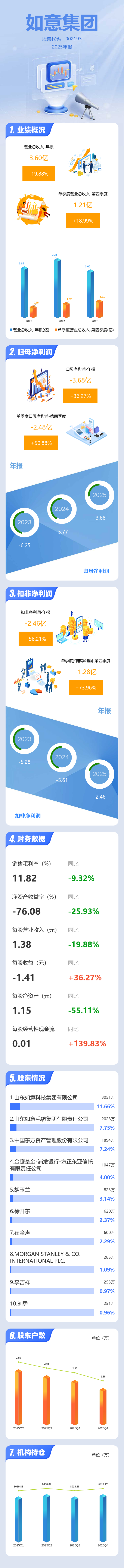 证券之星消息,如意集团2025年年报显示,当年度公司主营收入3.6亿元,同比下降19.89%;归母净利润-3.68亿元,同比上升36.28%;扣非净利润-2.46亿元,同比上升56.22%;其中2025年第四季度,公司单季度主营收入1.21亿元,同比上升19.0%;单季度归母净利润-2.48亿元,同比上升50.88%;单季度扣非净利润-1.28亿元,同比上升73.97%;负债率87.83%,财务费用6981.74万元,毛利率11.82%。