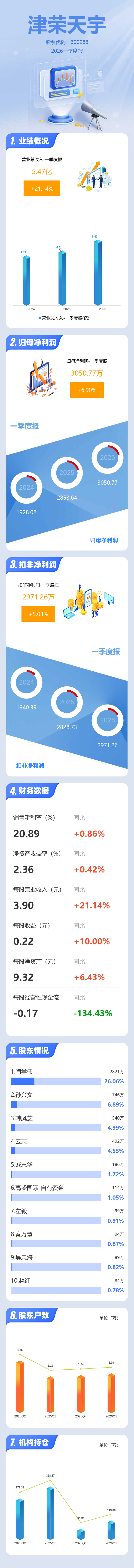 证券之星消息,津荣天宇2026年一季报显示,一季度公司主营收入5.47亿元,同比上升21.15%;归母净利润3050.77万元,同比上升6.91%;扣非净利润2971.26万元,同比上升5.04%;负债率45.6%,投资收益-89.63万元,财务费用1372.51万元,毛利率20.89%。