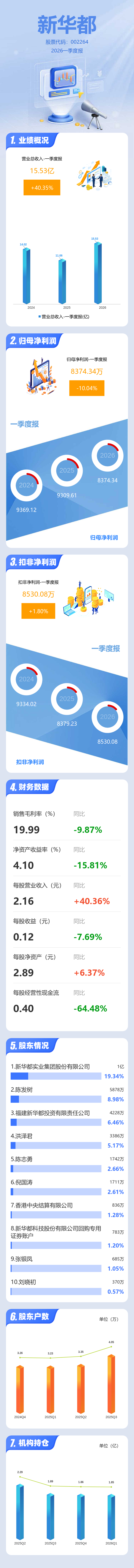 证券之星消息,新华都2026年一季报显示,一季度公司主营收入15.53亿元,同比上升40.35%;归母净利润8374.34万元,同比下降10.05%;扣非净利润8530.08万元,同比上升1.8%;负债率45.89%,财务费用118.3万元,毛利率19.99%。