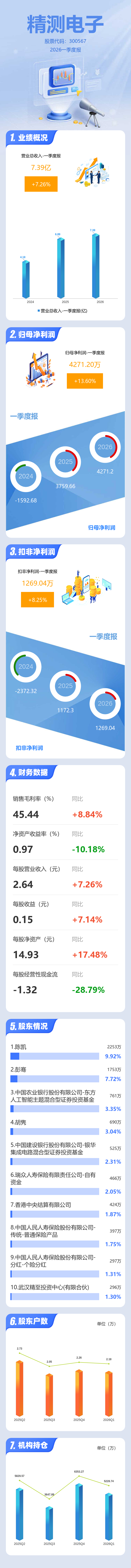 证券之星消息,精测电子2026年一季报显示,一季度公司主营收入7.39亿元,同比上升7.26%;归母净利润4271.2万元,同比上升13.61%;扣非净利润1269.04万元,同比上升8.25%;负债率53.31%,投资收益369.85万元,财务费用3676.15万元,毛利率45.44%。
